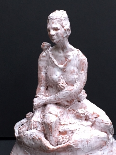 My sculptures are made of ceramic with glazed and painted finishes. I am currently working on sculptures entitled the Anna Maria series. Anna Maria was Antonio Vivaldi’s star students and the series represents my ideas of what she might have looked like getting ready to play her violin. The series represents the lightness and movement of Baroque music. The sculptures are getting taller and so far there are eleven Anna Maria sculptures. I am perfecting my technique for painting these sculptures. It involves layers of pure paint which is greatly watered down. Each sculpture has between 7 and 15 layers of paint. I am adapting a technique that I learned from studying with watercolor master Charles Reid.